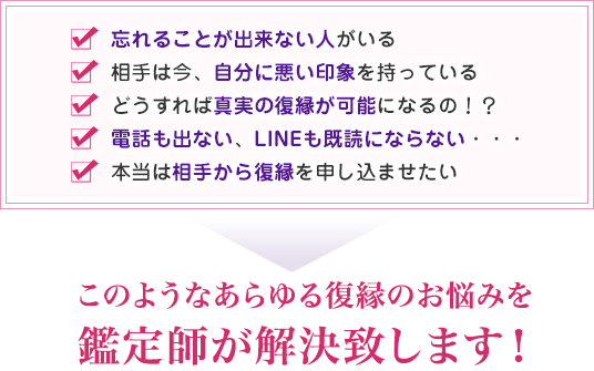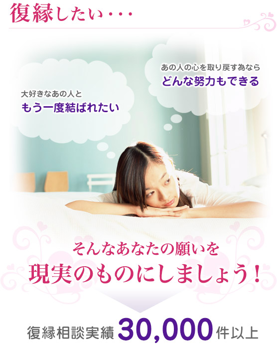 復縁のご相談がお得意な先生お客様から頂いている数々の復縁ご相談例を一部ご紹介させて頂きます。どうしても歳の差があるということで復縁に自信を失っています。 34歳女性、派遣社員です。20歳年上の男性とお付き合いしています。彼は離婚経験があり、一度彼と結婚を考えておりましたが、お互い歳の差が気になり、なかなか踏み切れず、破局しました。しかし、破局後もお互いが忘れられず、メールや電話で友達として接していました。その後、偶然にも町でバッタリ遭遇し、2人でじっくりと話をし、これは何かの縁だと思い復縁をしました。やはり彼といると心が安らぎ、彼とともに頑張りたいという気持ちにもなり、彼も同じような気持ちだと言ってくれました。 どうしても素直になれないので将来がとても不安。 30歳代のOLです。実は結婚を約束している彼がいました。いましたという過去形であえて書かせて頂きましたが、腐れ縁というか、まだ完全に分かれているわけではない、微妙な関係なのであえてそういう書き方にさせて頂きましたが、実は今まで2回程くっついたり離れたりと、まるで大学生のようなノリで、そんなことがありました。2回とも彼の浮気が原因です。一回目はさすがにショックで浮気がわかった時には、一方的にこちらからさよならしました。でも内心は忘れられずにいたのですが。そんな彼から誠意ある謝罪がありました。是非復縁したいと言うのです。気持はまだあったので、その時は許すことにしました。そんな事があってから、半年も経たないうちに、また同じような事がありました。友達から聞いた話が元ですが、見知らぬ女性と二人でお茶をしていたというのです。彼に問い但しましたが、そんな覚えはない、人違いだろうというばかりで、らちが開きません。ただのお茶ぐらいと思われるかも知れませんが、やはり前に一度浮気の前科があるので、どうしても信用できません。素直になれない自分がここにいるのです。 今は彼の言葉を信じるかどうかということに、二人の運命は掛かっているという状態です。私が信用して彼を許せば、元のさやに納まるし、信用出来なければ、別れることになるかもしれないし、何とも宙ぶらりんな状態です。どうしたらいいでしょうか。このまま彼を信じていいものでしょうか。冷静になって考えてみても、どうしても素直になれないのです。このまま彼と一緒にいて果たして将来幸せになれるのだろうかとか、考えてしまって、不安で仕方ありません。